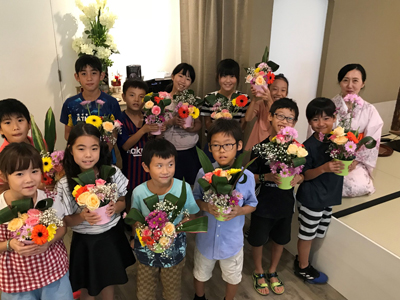 子供達には、日本の素晴らしい伝統文化を知ってほしいという思いから、お茶・お花・スタンディング書道・落語などの体験をしてもらいました。