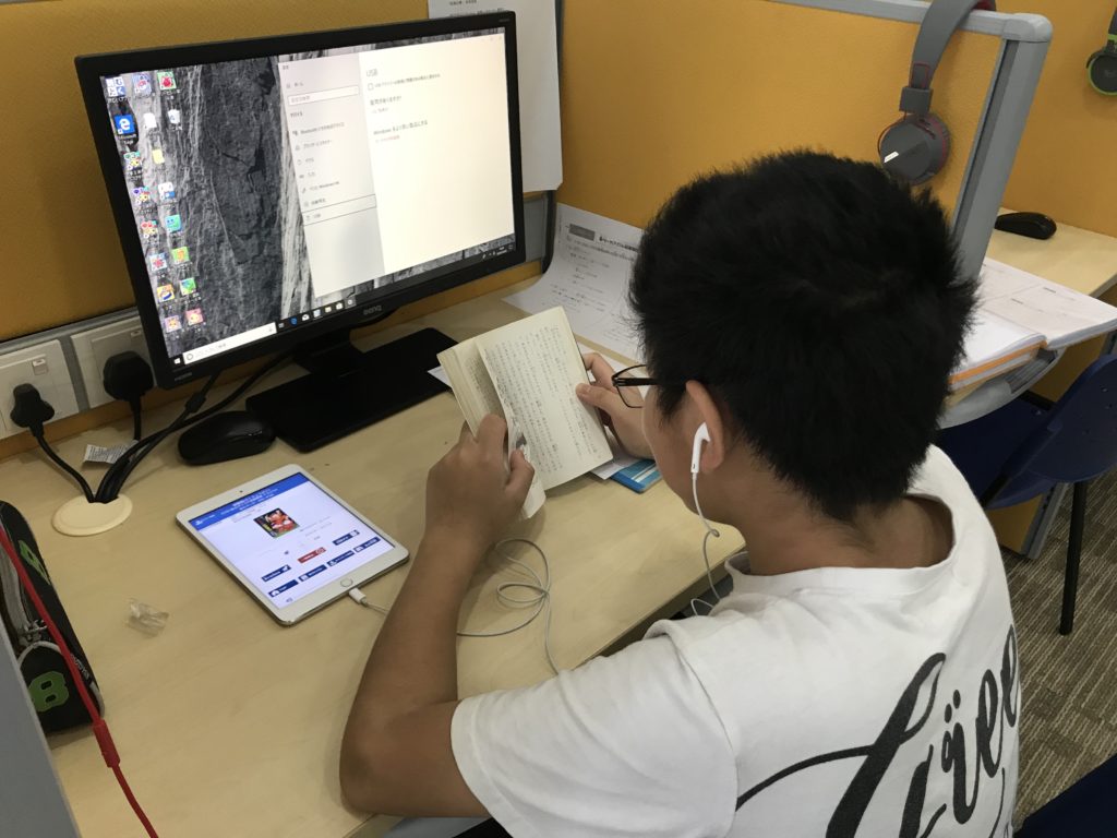 まなび舎では、PCの朗読音声を聞きながら、音声に合わせて読書をしていきます。音声サポートにより読書に集中でき読書速度もアップ。厳選された「良書」をたくさん読むことができるようになる結果、語彙力と表現理解力が高まり、「国語力」が高まるプログラムです。また、毎年2回の「読書指数診断」で、読書の継続で伸びる力を数量的・客観的に診断いたします。